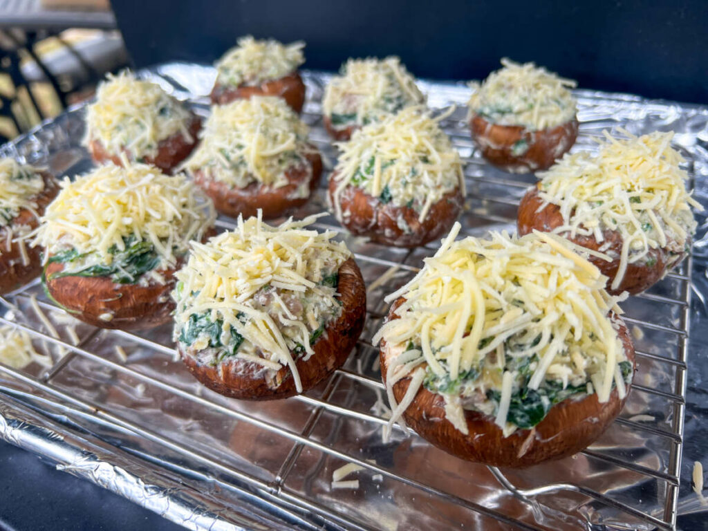 Cook the Mushrooms: Place the stuffed mushrooms on the grill or in the oven and cook for about 25 minutes, or until they’re golden brown.